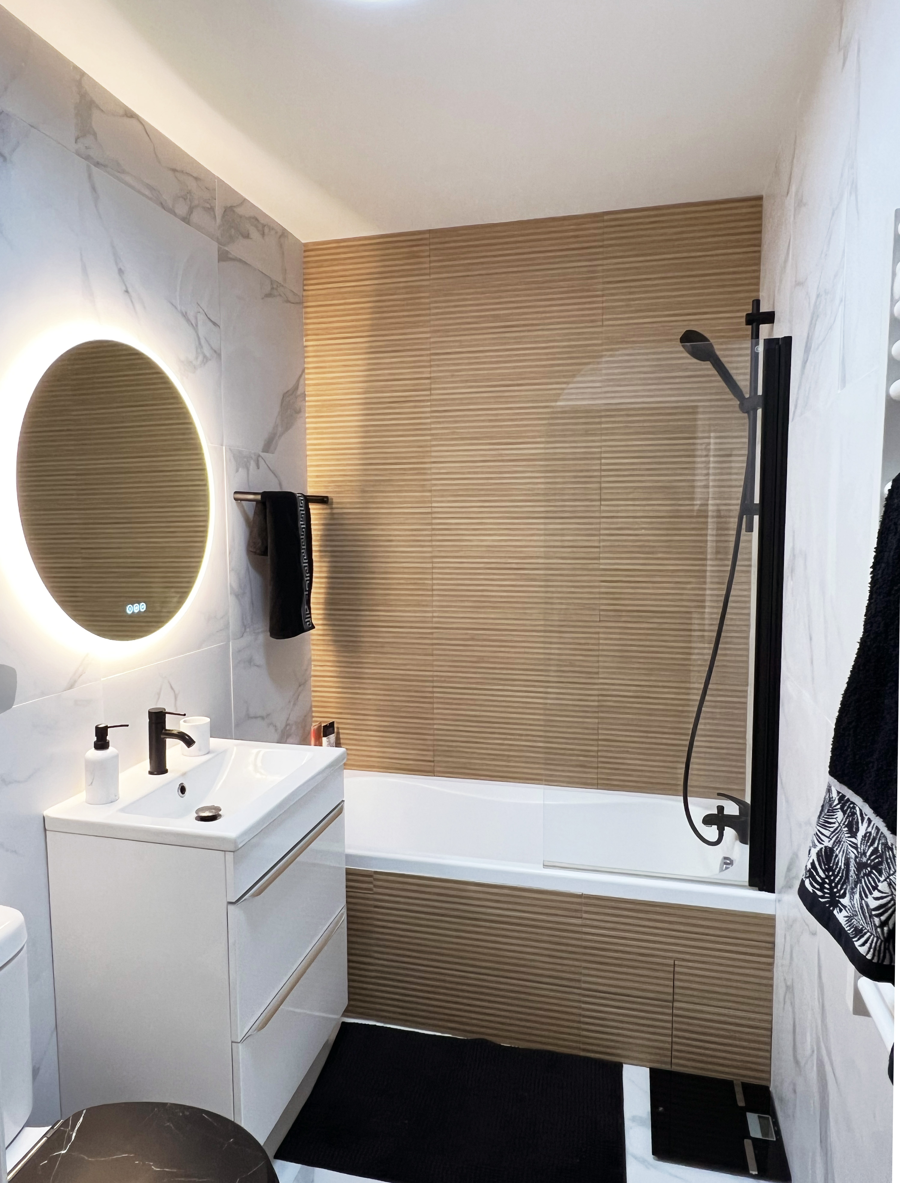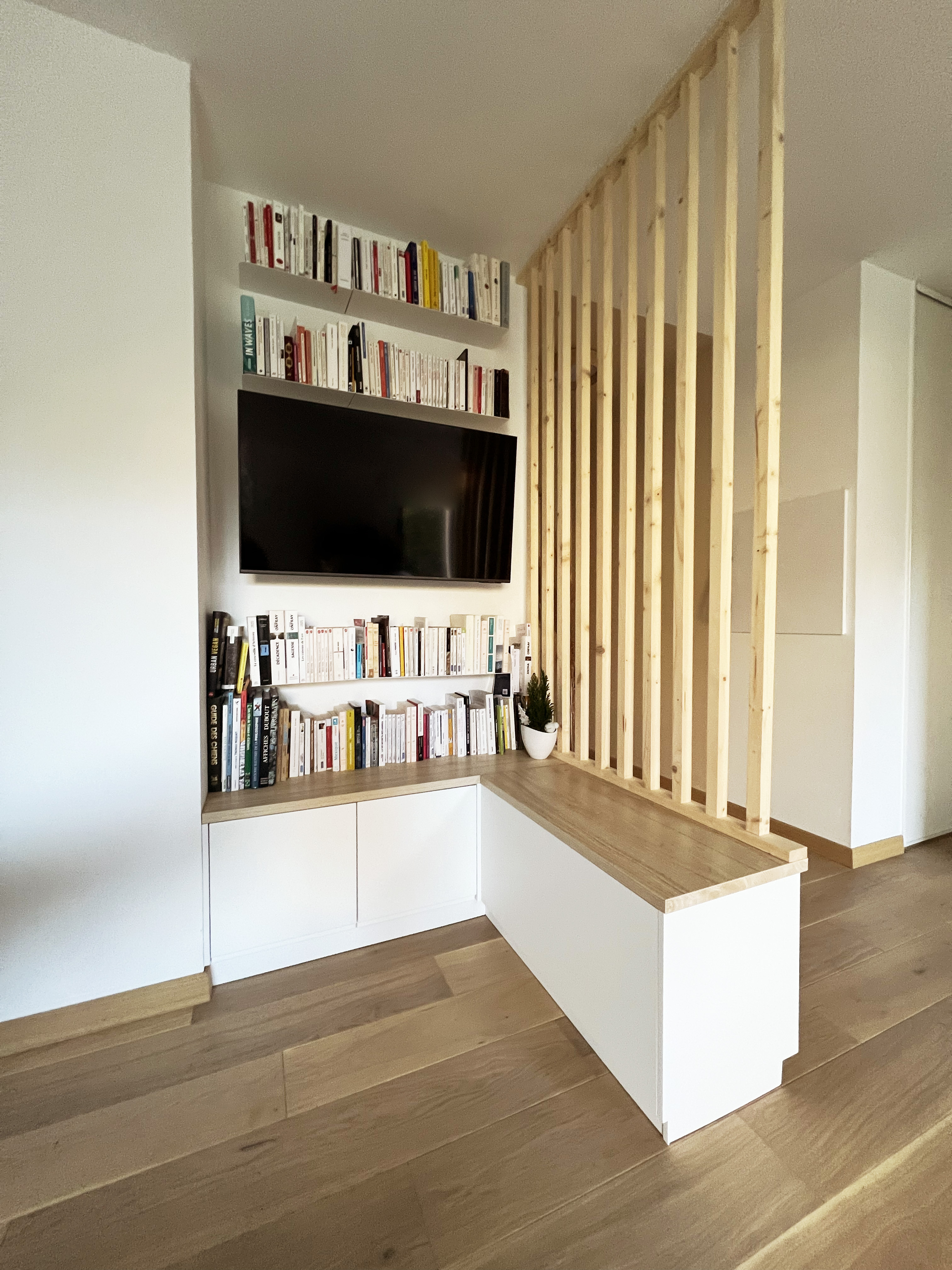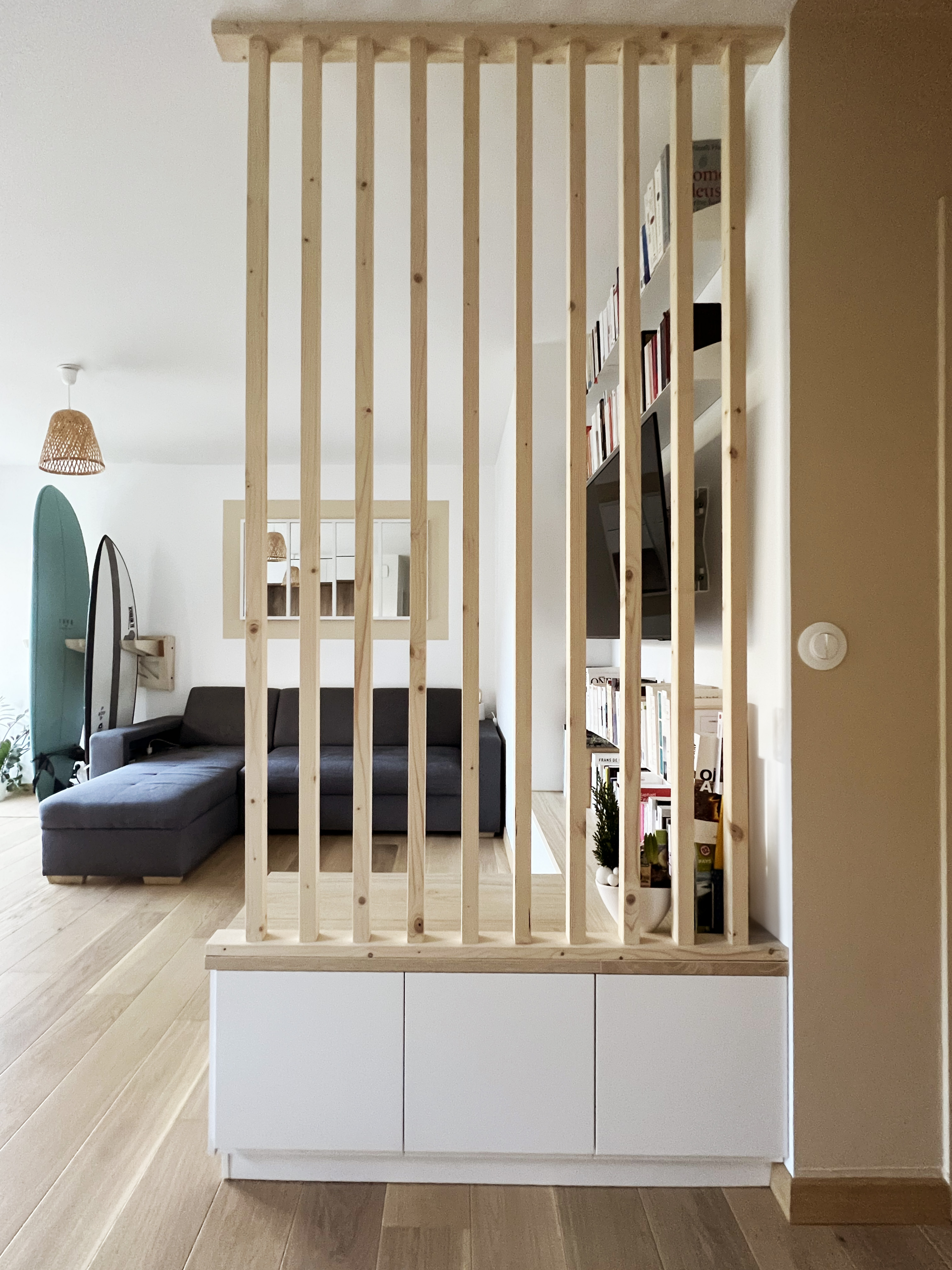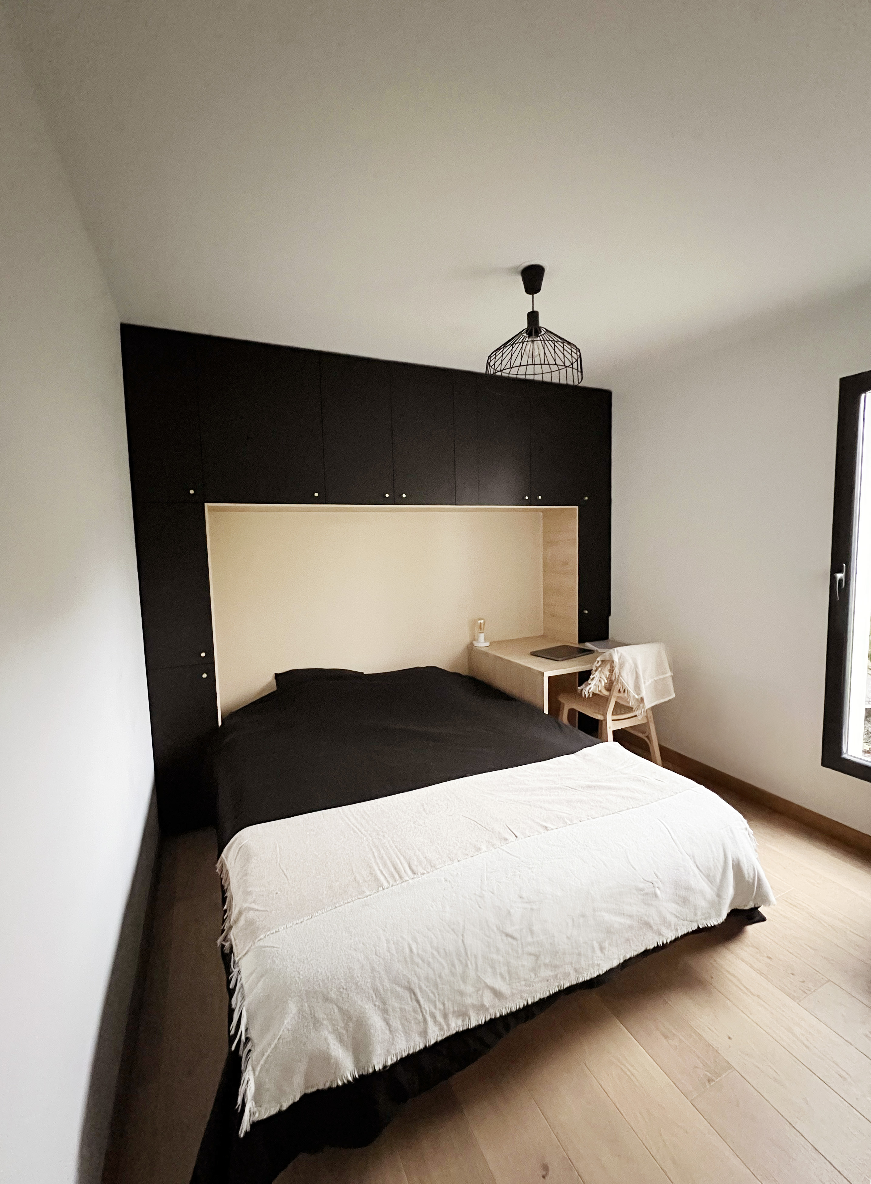 Dans ce bien, la disposition des espaces a été entièrement revue pour permettre un confort dans chacune des fonctions du foyer, cuisine, salon, salle à manger, chambre, bureau, rangement…