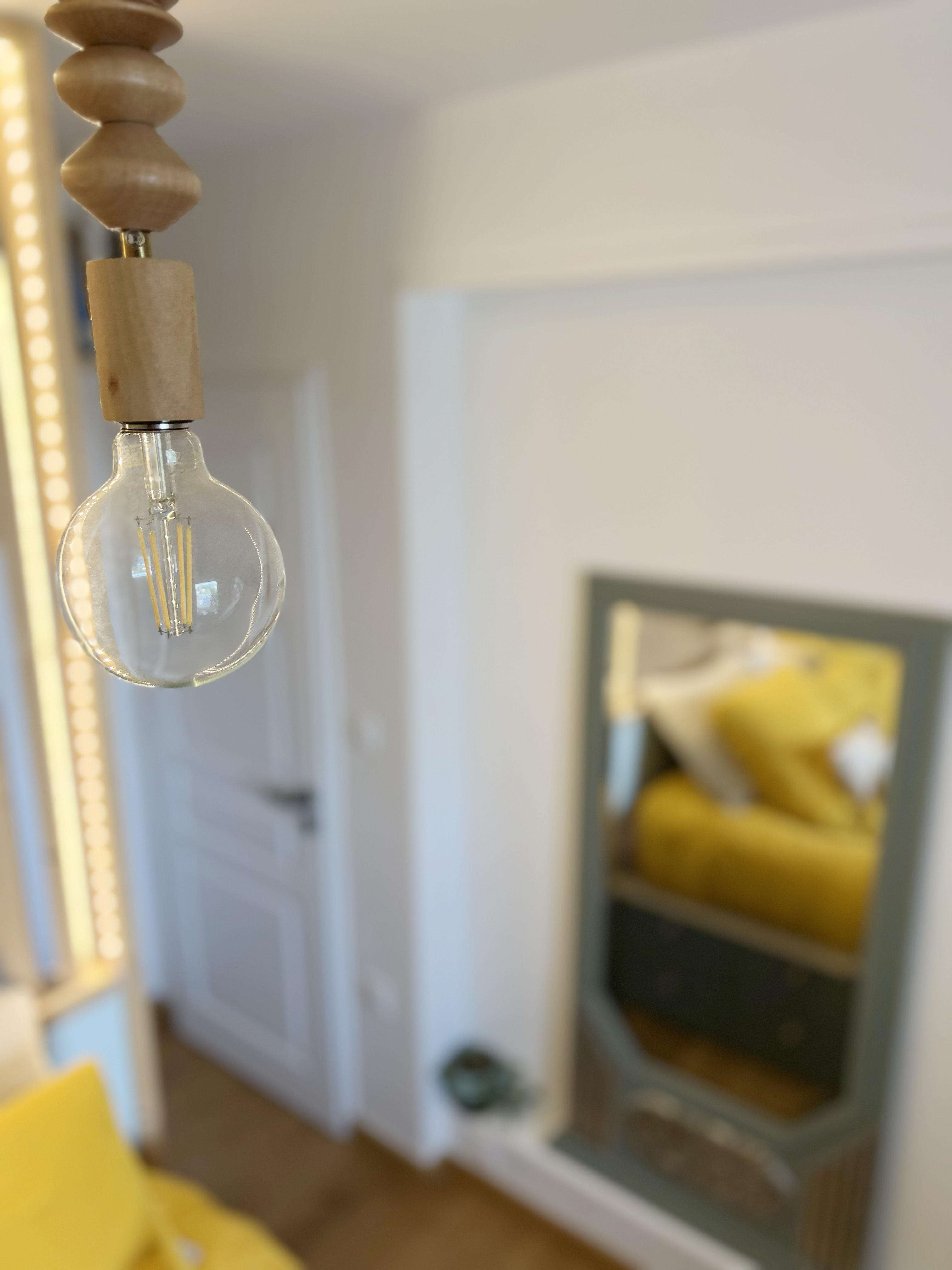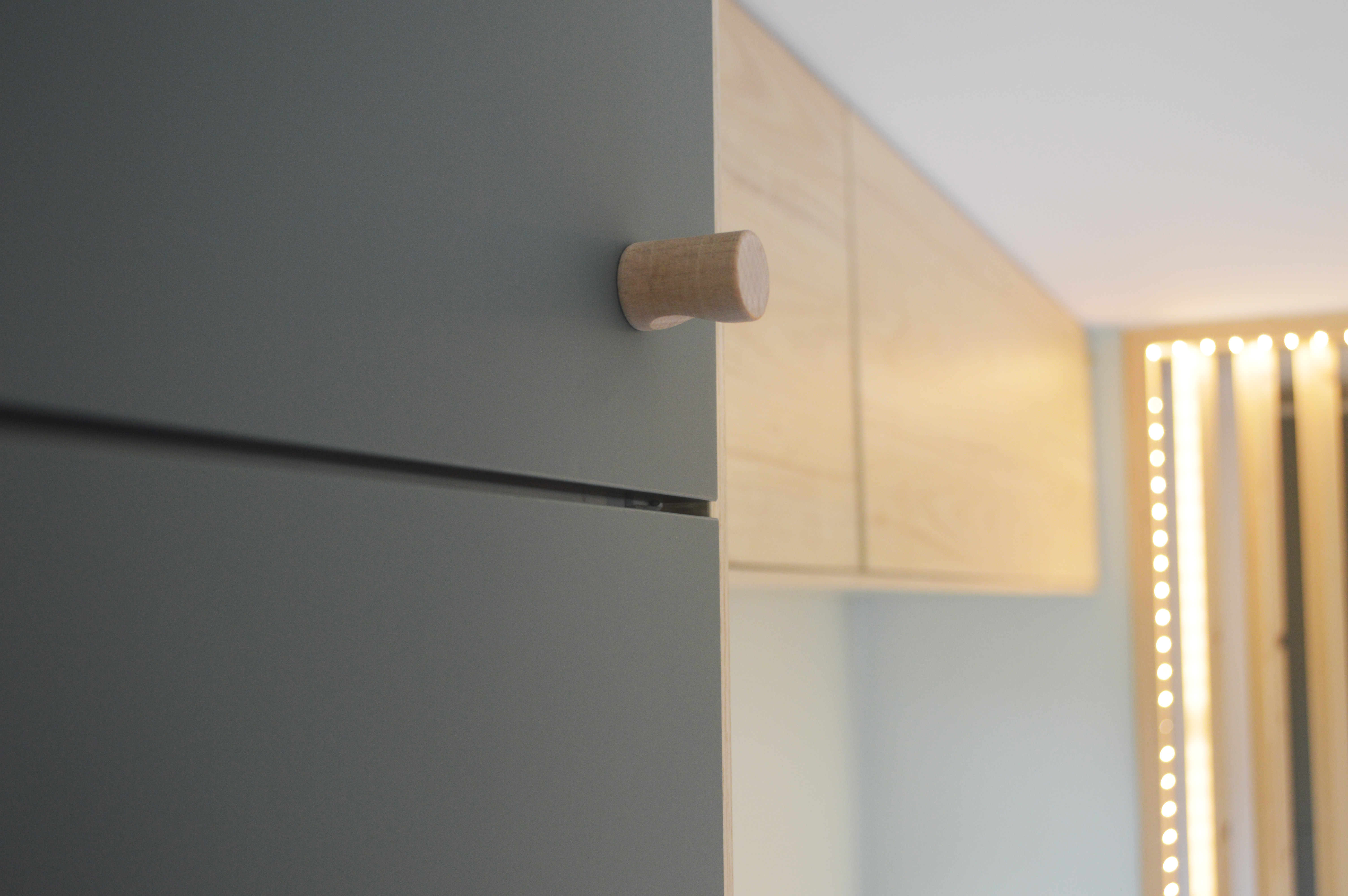 Aménager une chambre dans 7m2, décloisonner pour créer un second espace coiffeuse et bibliothèque, tout en respectant le lieu de sommeil cocooning où la vue et la perspective s’offrent à voir depuis le lit.
